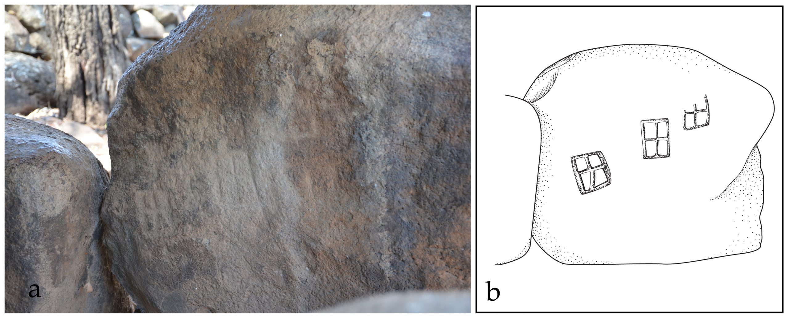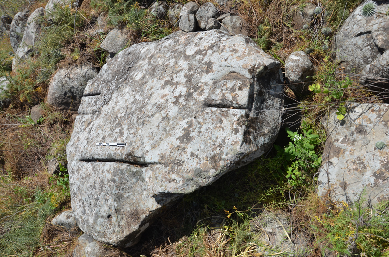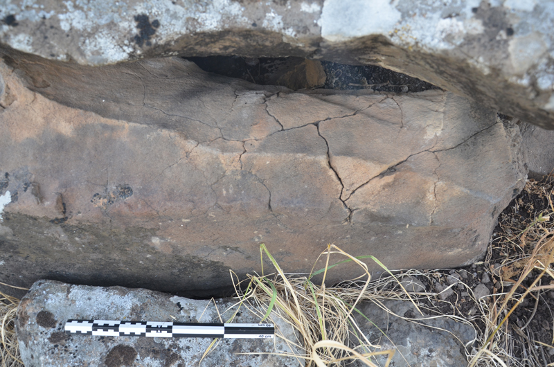 Few dolmens of the Qiryat Shemona North Field survived the development and construction. Among them is the largest dolmen reported of that field, located on the east facing margin of a low hill, overlooking the Hula Valley (Dolmen QSh-1; 254870/ 790860; Fig 9a, b). This dolmen is constructed of three upright large slabs forming a chamber 180 x 80 cm and covered by a single large capstone 200 × 200 × 40 cm in size. The chamber is surrounded by well-built stone wall c. 10 m in diameter. On the flat surface of one of the eastern stones of the surrounding wall, a board game was engraved in an unknown period. Possibly the most unique feature of Dolmen QSh-1 is the lines carved into the upper surface of the capstone. The location and nature of these marks suggest that they are not functional quarry features but rather were carved for a different reason. What appears to be the carving of a face in the stone points to the possibility of symbolic art; however, more study is needed before such suggestion can be substantiated.