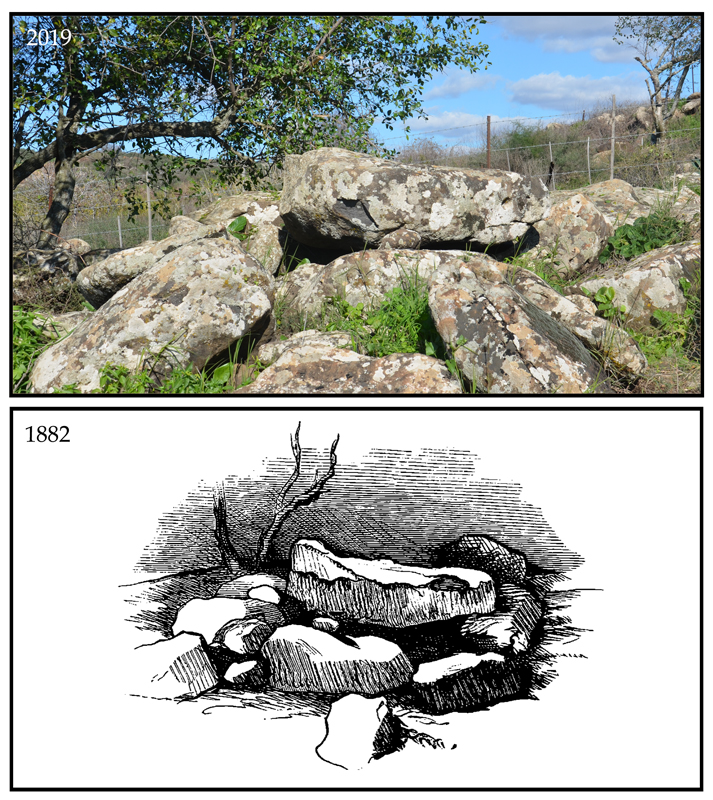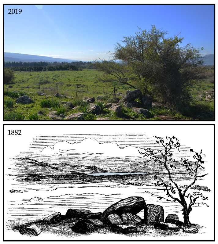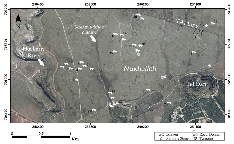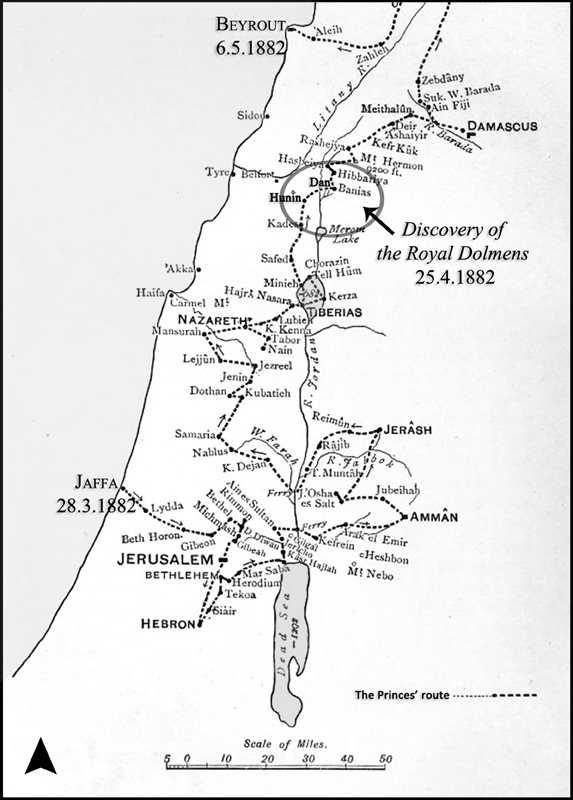 A vast field of basalt dolmens and additional stone structures spreads eastward from the Hasbani Stream to the foothills of the Hermon Mountain. The dolmens in this field were first discovered in spring 1882, when Prince Albert Victor and his younger brother, prince George (later King George V) toured the Holy Land guided by C. R. Conder of the PEF. Walking the route from the Upper Galilee to Tel Dan, the royal party discovered and documented four basalt dolmens. Their discovery was described as a highlight of the three-year, royal worldwide cruise . For 130 years, this report has remained the primary source for our knowledge of the Nuheille Dolmens (Fraser 2018; Hartal 1987). In more recent history, this region was located on the border between the French and British mandates and since 1949 between Syria, Lebanon, and Israel, inaccessible for decades and nearly forgotten.