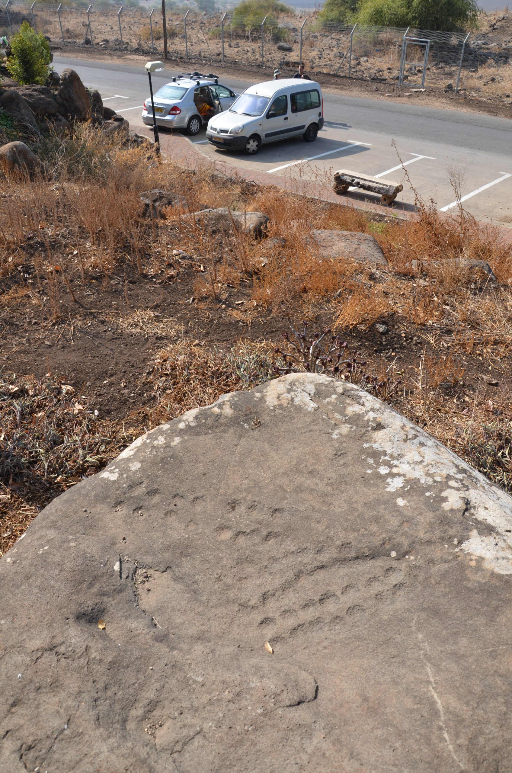 Today, the dolmen is surrounded by the ruins of the Ottoman village Qal‘a el-Qara‘neh, currently part of the Meshushim Nature Reserve. It appears that the dolmen is a remnant of a vast dolmen field, spreading south and southwest on the western slopes of the Golan Heights along the eastern bank of the Jordan River canyon