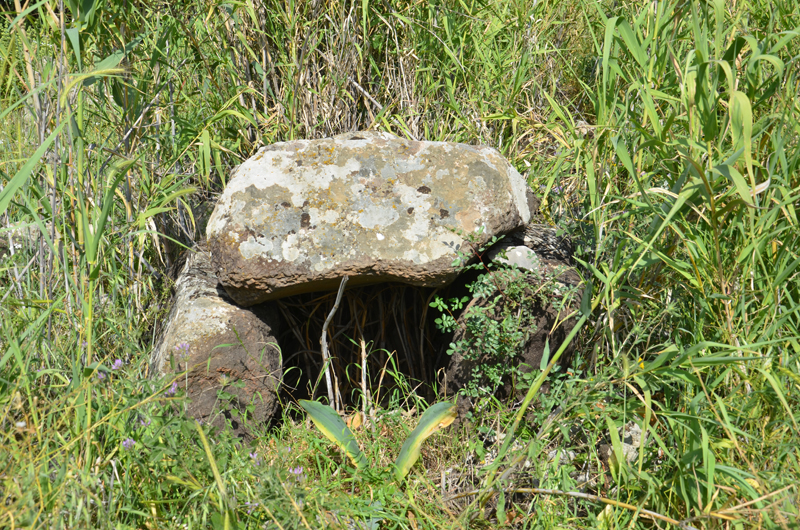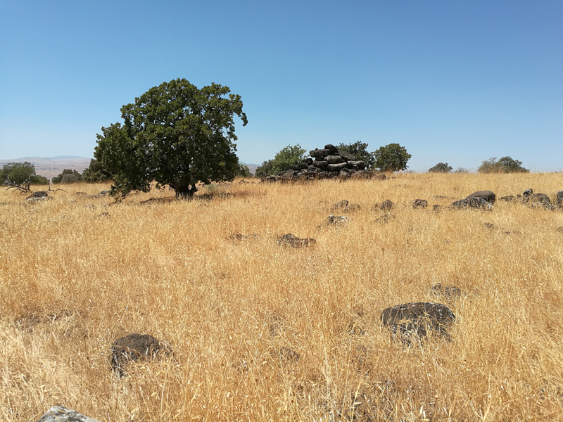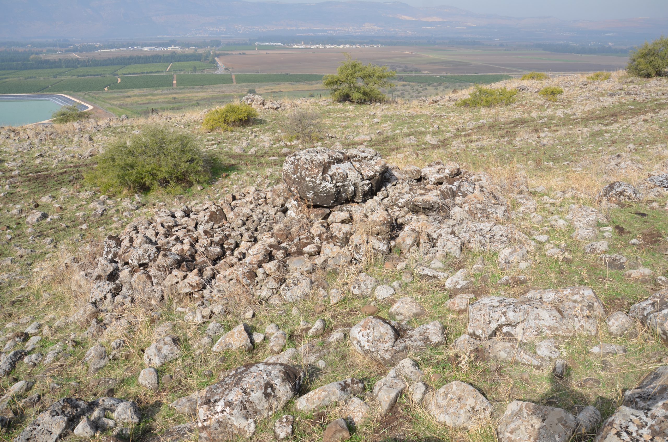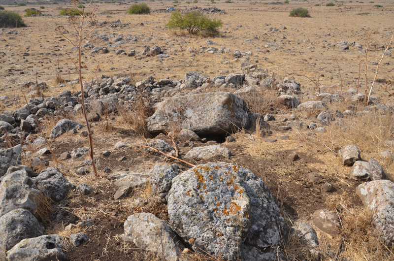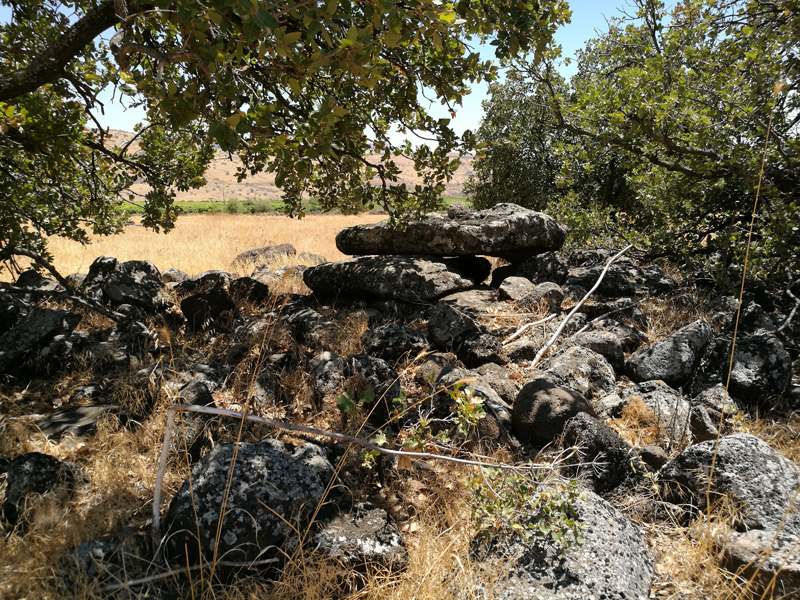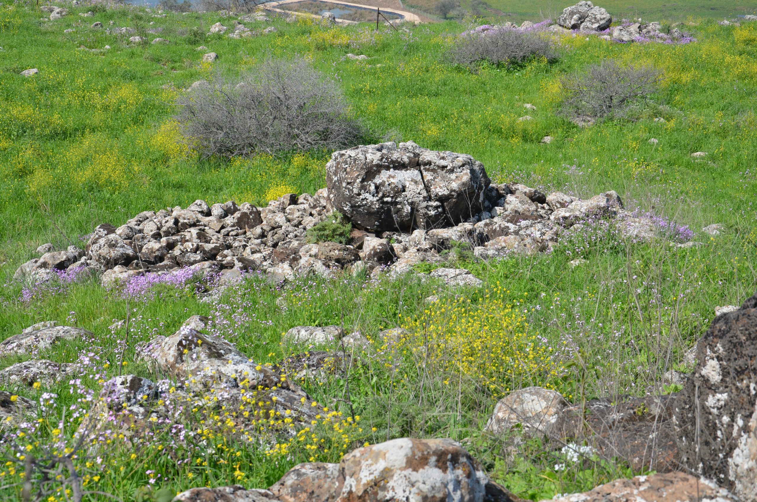 The Shamir Dolmen Field extends over a few square kilometers of Middle Pleistocene Age basalt flows. The flows formed into a series of very large slabs and giant boulders, few meters in size and the landscape is of steps (probably of tectonic origin) slanting westward into the Hula Valley, some 150 m below. These giant slabs were the ideal raw material for dolmen construction. Many of the dolmens were built directly on the slopes, simplifying transport of the giant stones. Yet, numerous dolmens were also built on the plateaus between and above the slopes, meaning that the giant rocks were carried uphill a considerable distance to their final position. While many types of dolmens can be identified in Shamir, an overall architectural line can be observed. The Shamir Dolmen Field includes most dolmen types, at times scattered within a few meters of one another. Yet, the most distinct type of Shamir dolmen is a circular tumulus, built around a large central chamber entered through a vestibule and covered with a giant capstone. Each of the massive capstones in the Shamir Dolmen Field rises out of its tumulus, most likely designed by the dolmen builders as a prominent landmark, visible even today.