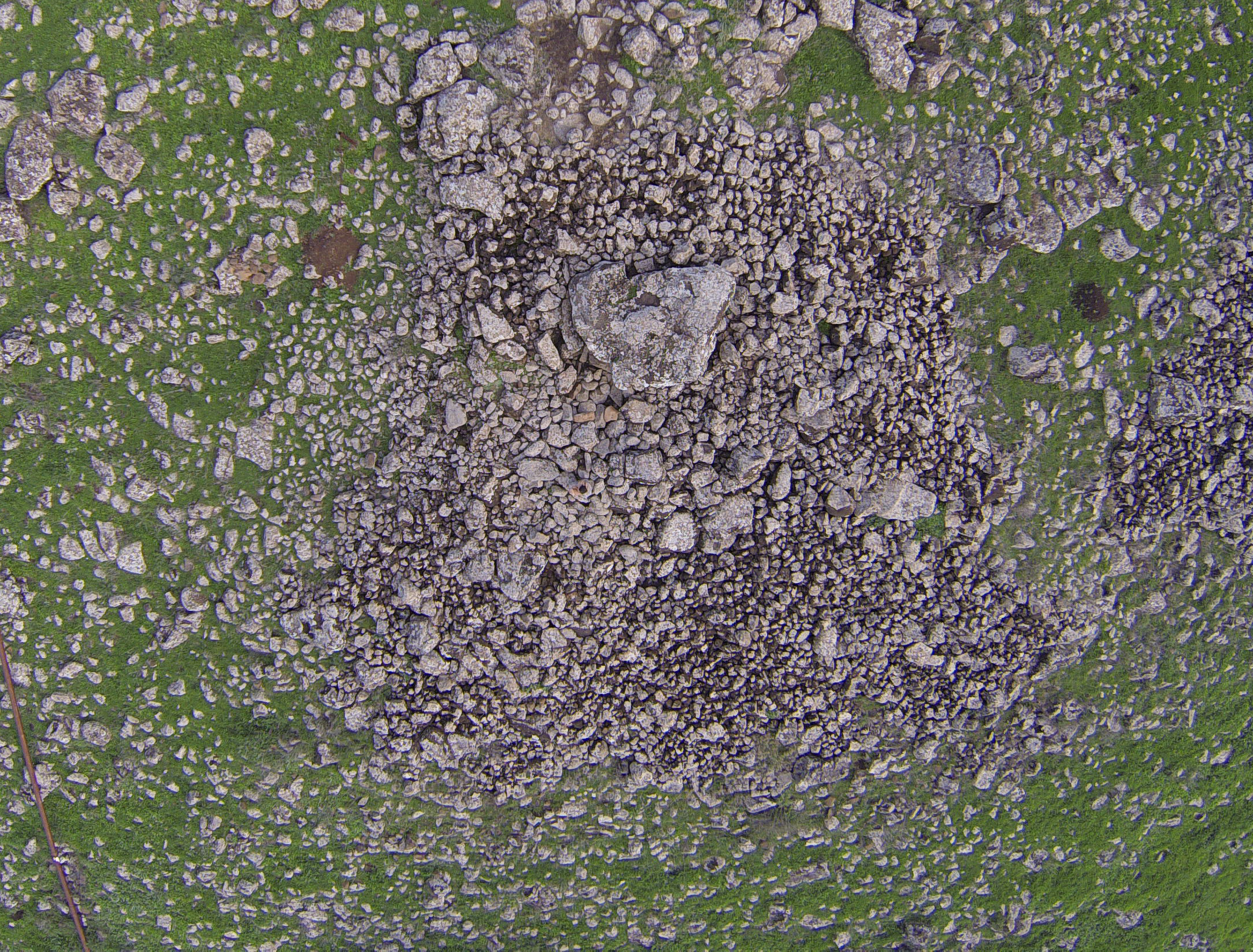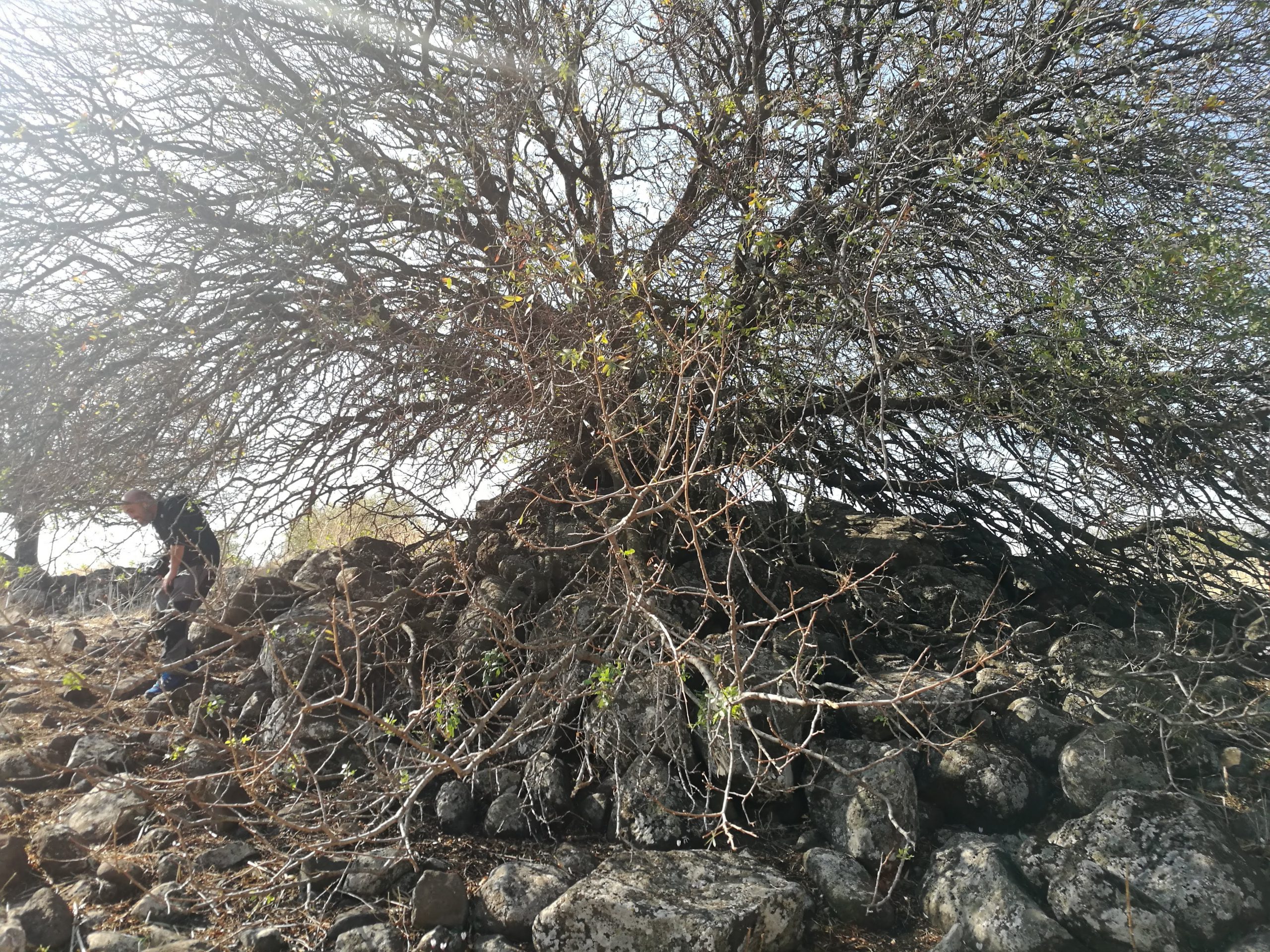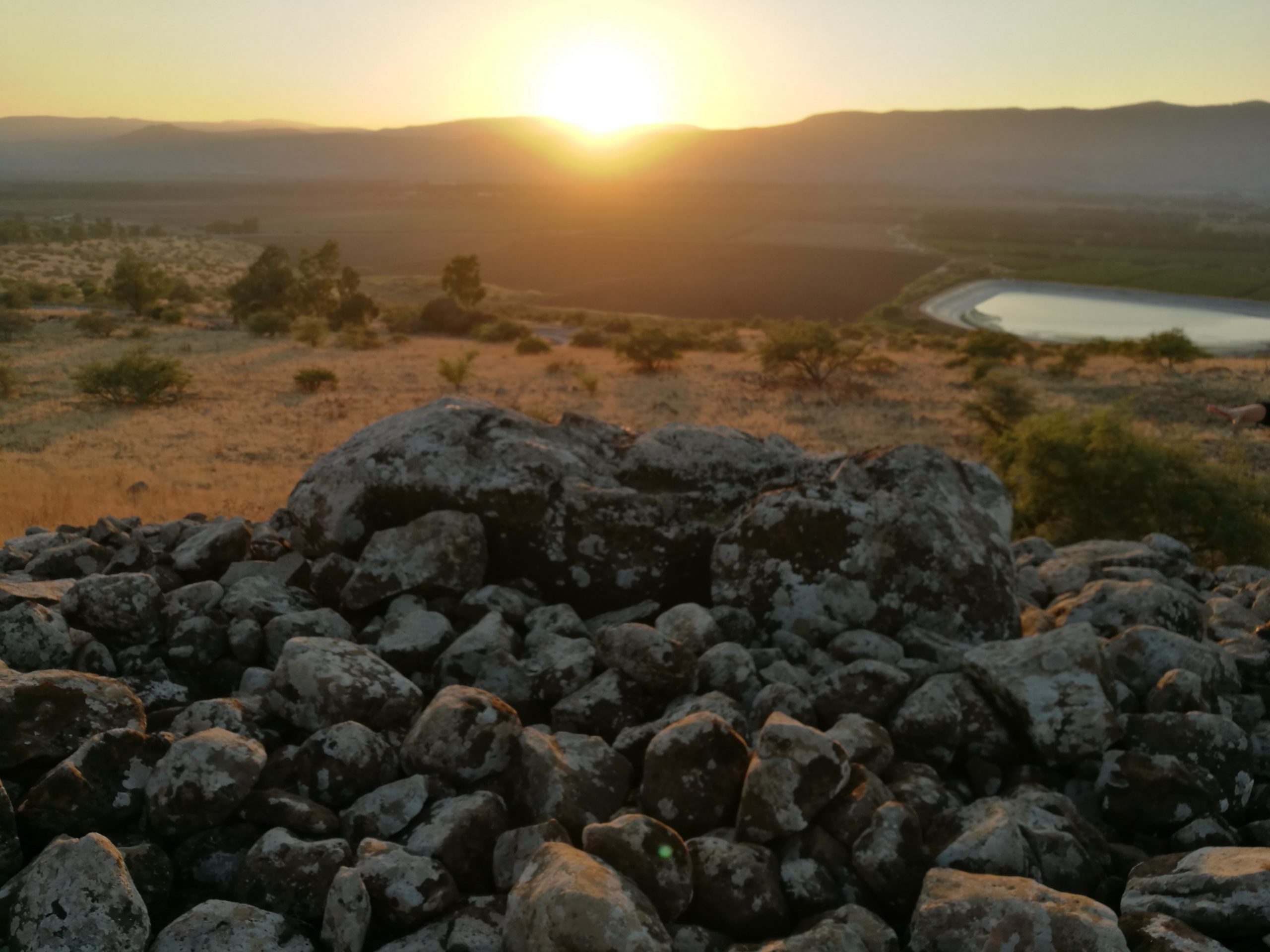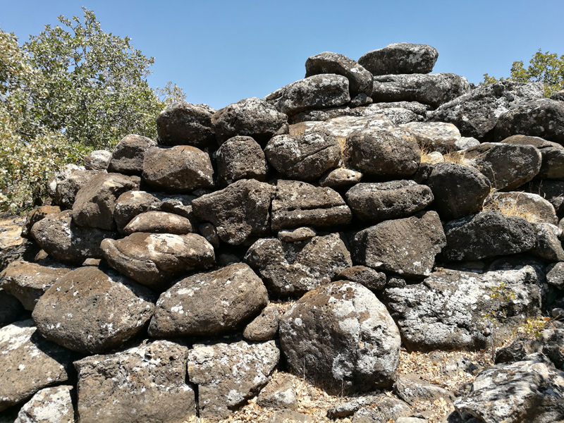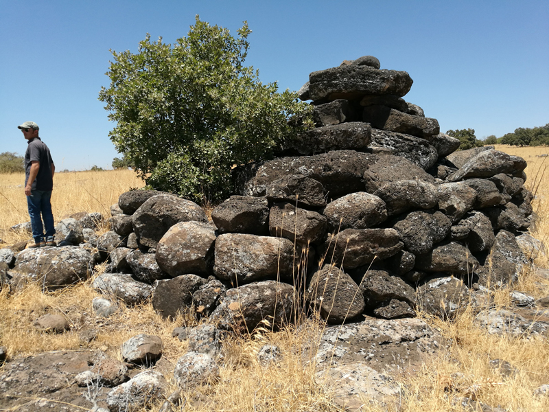 The Shamir Dolmen Field extends over a few square kilometers of Middle Pleistocene Age basalt flows. The flows formed into a series of very large slabs and giant boulders, few meters in size and the landscape is of steps (probably of tectonic origin) slanting westward into the Hula Valley, some 150 m below. These giant slabs were the ideal raw material for dolmen construction. Many of the dolmens were built directly on the slopes, simplifying transport of the giant stones. Yet, numerous dolmens were also built on the plateaus between and above the slopes, meaning that the giant rocks were carried uphill a considerable distance to their final position. While many types of dolmens can be identified in Shamir, an overall architectural line can be observed. The Shamir Dolmen Field includes most dolmen types, at times scattered within a few meters of one another. Yet, the most distinct type of Shamir dolmen is a circular tumulus, built around a large central chamber entered through a vestibule and covered with a giant capstone. Each of the massive capstones in the Shamir Dolmen Field rises out of its tumulus, most likely designed by the dolmen builders as a prominent landmark, visible even today.