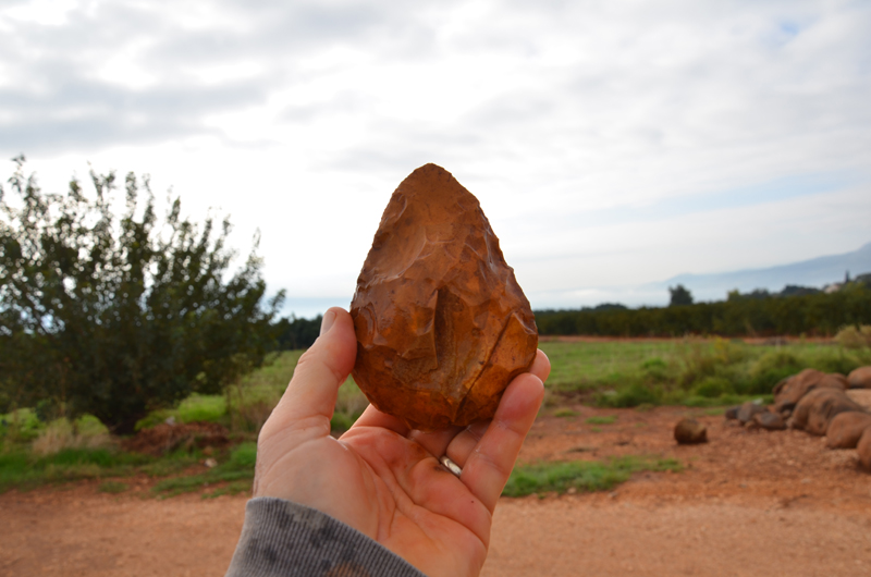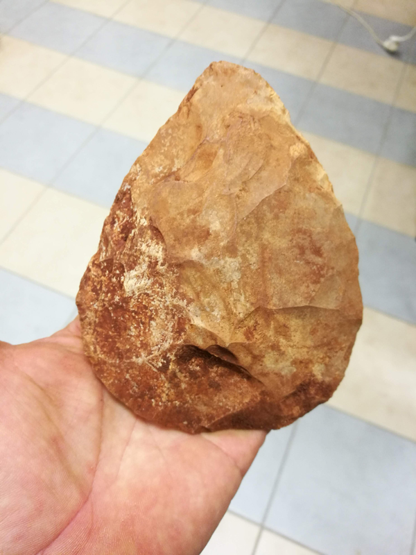 General description – The majority of handaxes were produced on flint pebbles, while some were made on tabular flint and some on flakes. These flakes are usually either primary (cortical) or a cobble that has been split in two. In many examples, the striking platforms and bulb of percussion were removed by flaking. The workmanship of the tools is very good, as indicated by the high degree of symmetry, the fine bifacial knapping and the fine retouching and shaping of the edges. 45.6% of the handaxes are cordiform and 41.6% are round or ovate. Together they present a very pronounced dominance of ovate shapes (over 90%) over pointed ones. There is also a small group of cleavers, six of which were made on flakes (Stekelis and Gilead 1966).is