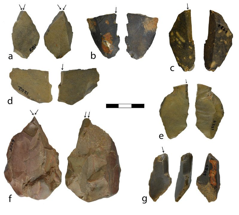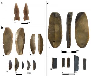 High frequencies of burins are present in layers 3c, 4 and 5, but they are rare in Layer 3a. Such exceptional percentages of burins hint that a specific activity was executed at the site, possibly related to the acquisition of aquatic resources. The size of the Layer 5 burin assemblage is sufficient to present preliminary frequencies of the types represented. Burins on the break or natural surface (38%) and burins on notch or truncation (30%) are by far the best represented. Among the latter, the most frequent sub-types are burins on concave (8%) and straight truncations (7%). Dihedral burins are also represented (12%). Sickle blades, mostly of the unretouched or curved-backed variety, are present in all layers, except Layer 5. Finally, perforators and notches/denticulates are well represented in layers 3a and 5.
